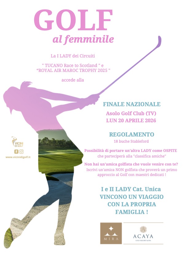 La 1^ Lady, premio speciale cumulabile con i premi gara, parteciperà ad UNA FINALE PER SOLE DONNE, presso l’ASOLO GOLF CLUB (TV), lunedì 20 aprile 2026.